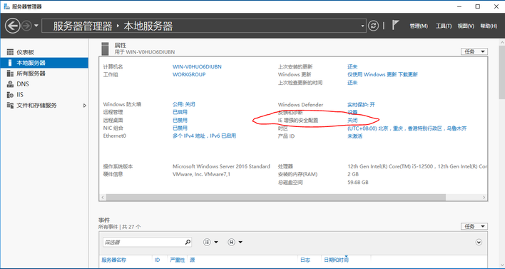 Windows server 2016 默认是开启了IE浏览器增强的,导致在测试过程中无法访问目标网站。开始—>服务器管理器—>本地服务器—>IE增强的安全配置—>关闭