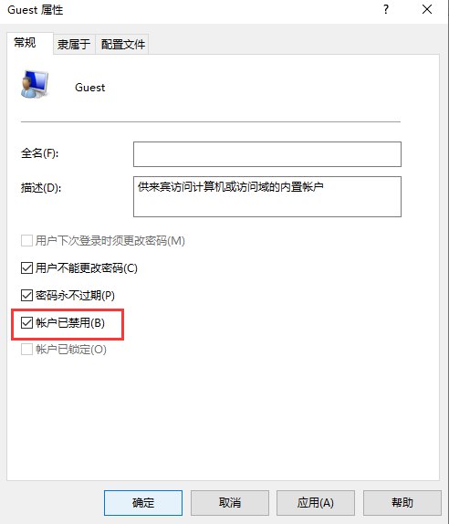 右键guest---属性---勾选账户已禁用