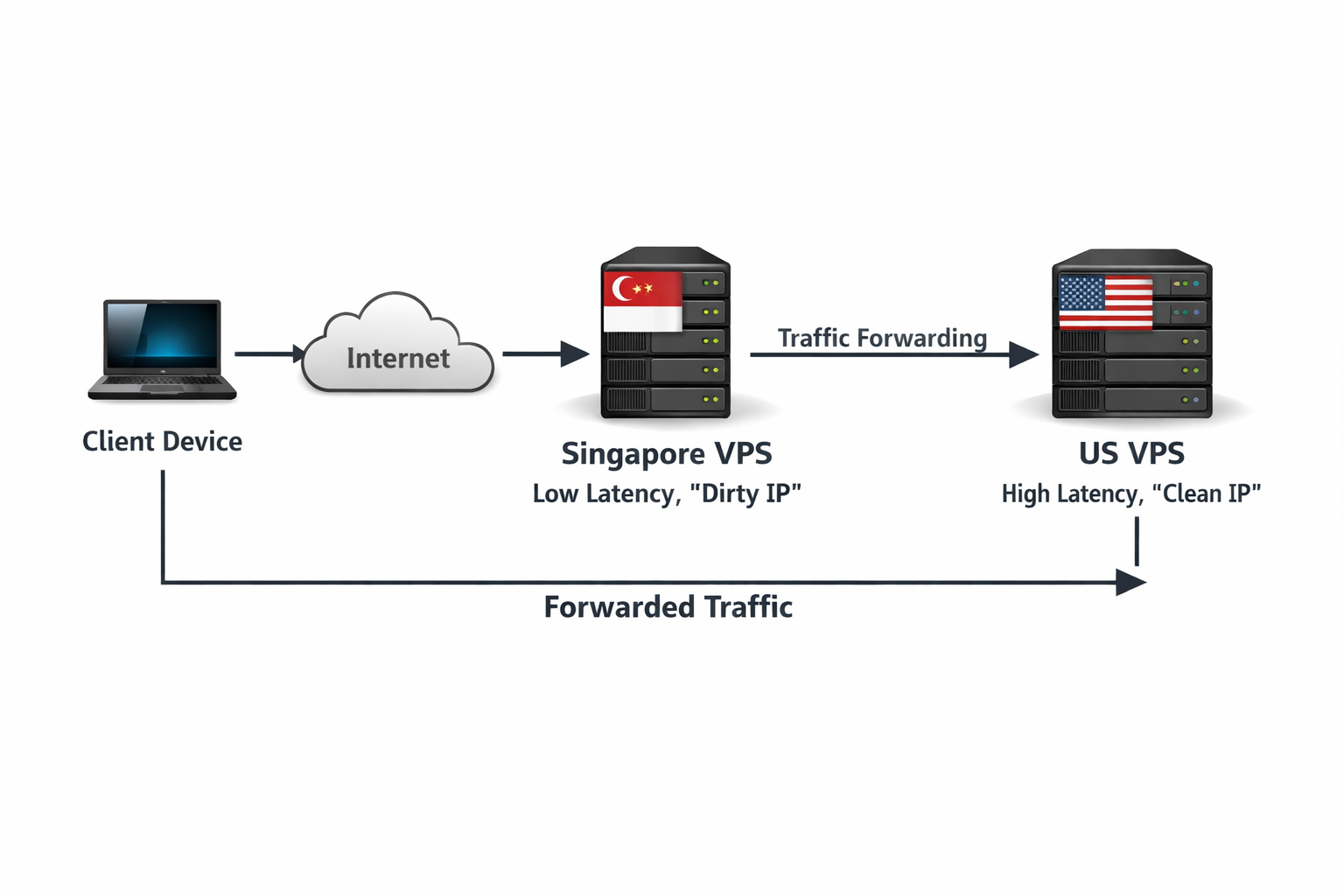 网络部署中常会遇到需要平衡速度与IP信誉的情况。比如我手头有两台VPS,一台位于新加坡,延迟表现优异但IP欺诈较高;另一台则是美西直连服务器,虽然延迟较高但IP纯净度极好。我尝试将新加坡节点作为流量中转站,通过它将客户端的访问请求转发到美国服务器完成最终落地。具体操作是,在美西机器上部署节点服务并记录好IP地址及端口信息,接着在新加坡服务器安装Realm并配置好转发规则,这样客户端连接新加坡节点时就能利用低延迟优势,同时通过美西干净IP完成对外访问。这种中转架构在需要兼顾速度与IP可信度的场景中非常实用。
