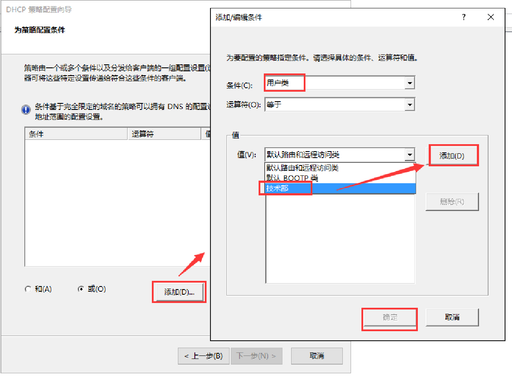 通过策略为特定的客户端计算机分配不同的IP地址与选项时,可以通过DHCP客户端所发送的供应商类别、用户类来区分客户端计算机。 EX:通过用户类标识符来识别客户端计算机——假设客户端client1的用户类标识符为“IT”。当client1向DHCP服务器租用IP地址时,会将此标识符“IT”传递给服务器,我们希望服务器根据此标识符来分配客户端的IP地址范围为192.168.10.150/24-192.168.10.180/24,并且将客户端的DNS服务器的IP地址设置为192.168.10.1。