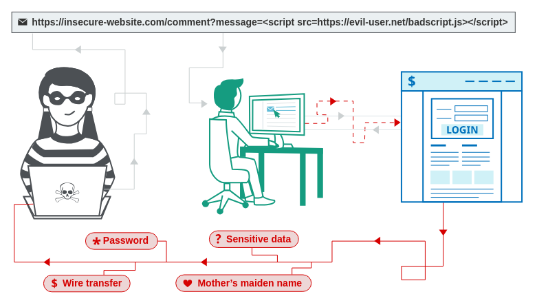 - 恶意脚本可以窃取用户的登录凭证、信用卡信息、个人身份信息等敏感数据,然后将这些数据发送给攻击者。