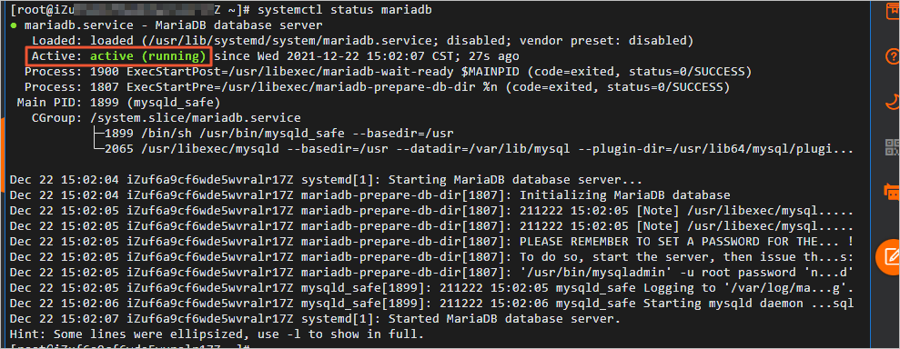 返回结果如下,您可以看到active (running)时,表示MariaDB Server启动成功。