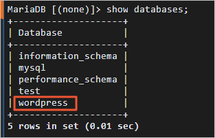 返回结果如下,您可以看到您创建的WordPress数据库。
