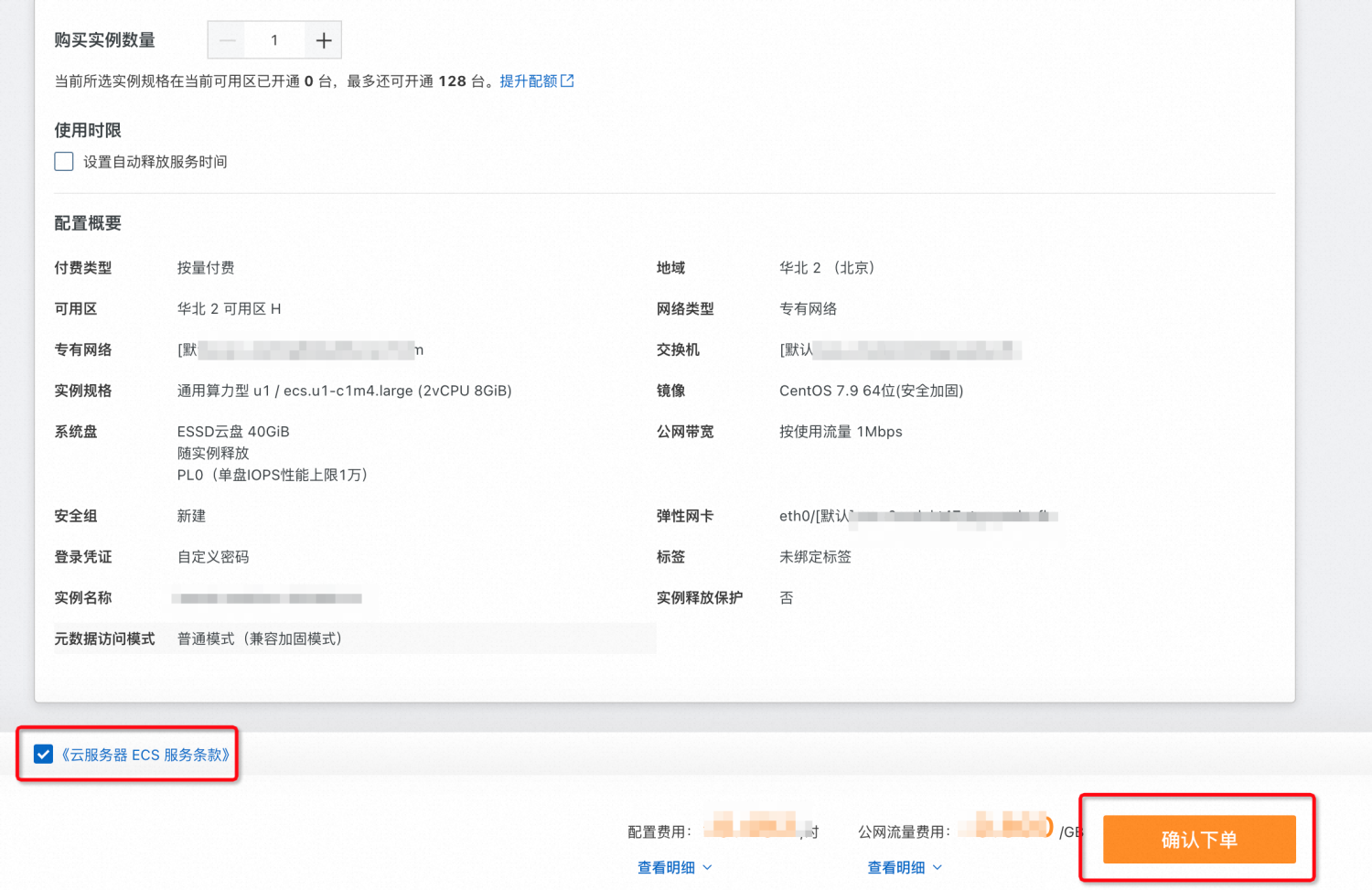 - 勾选服务条款,点击确认下单,即可创建ECS。