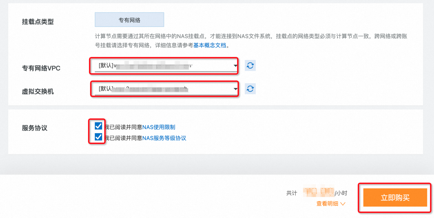 此处选择ecs创建的默认专有网络和默认虚拟交换机。勾选服务协议,并点击立即购买。