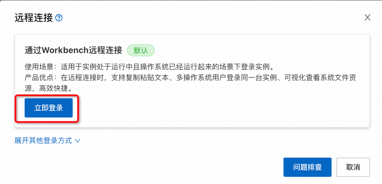 如下所示,在通过Workbench远程连接中,点击立即登录。