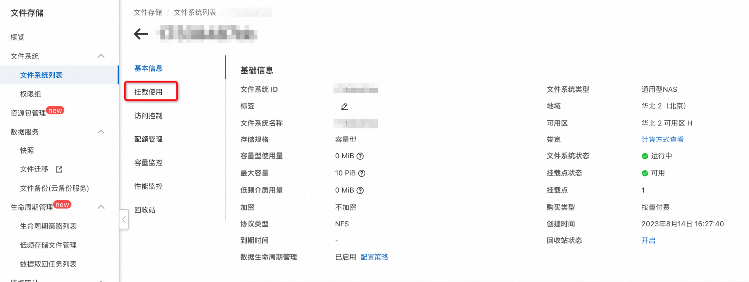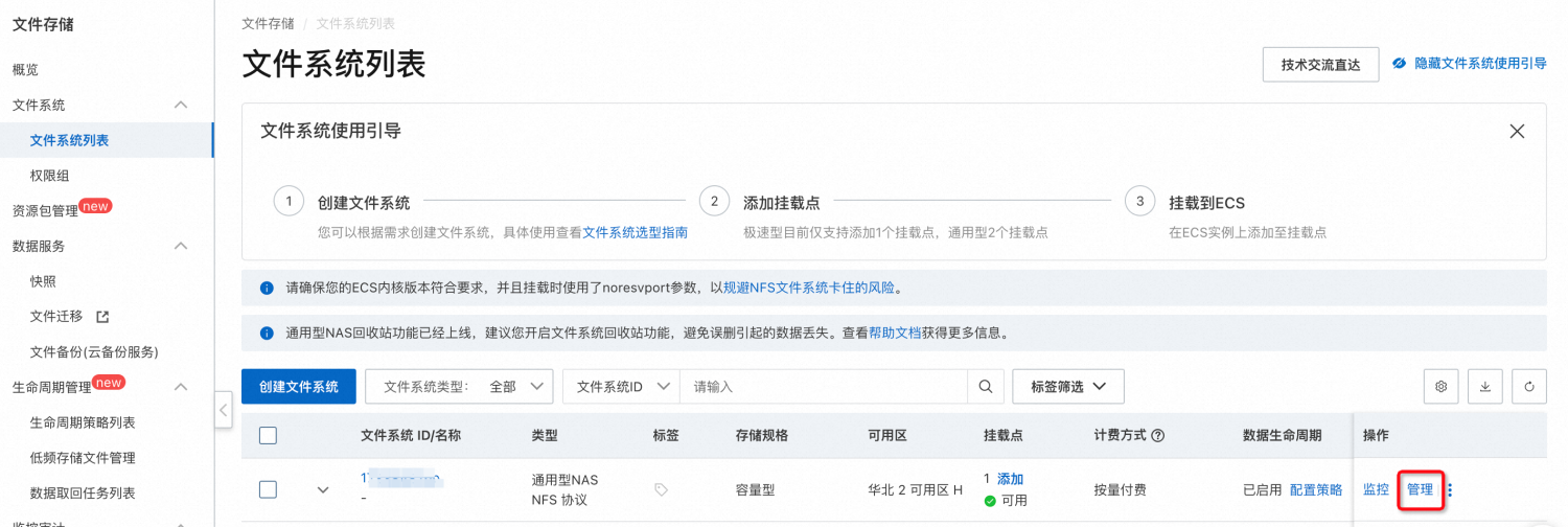 - 在文件系统列表中,如下所示,找到刚才创建的文件系统,并在右侧操作列下点击管理。