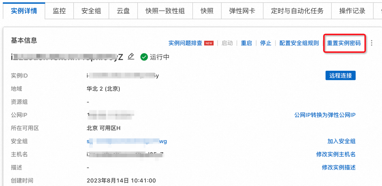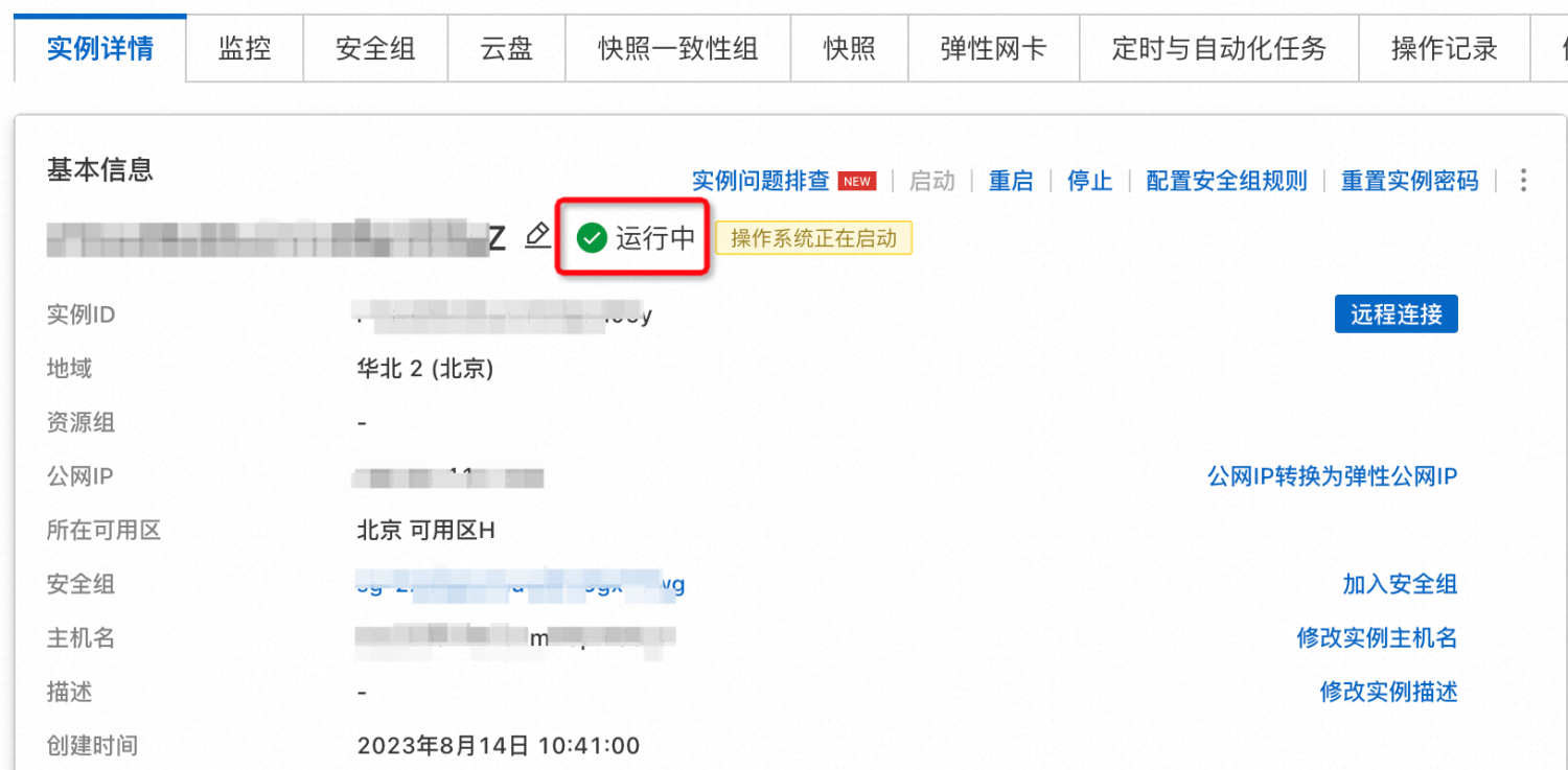 3.4 稍等一会,会看到实例显示运行中,此时密码已更改完成。