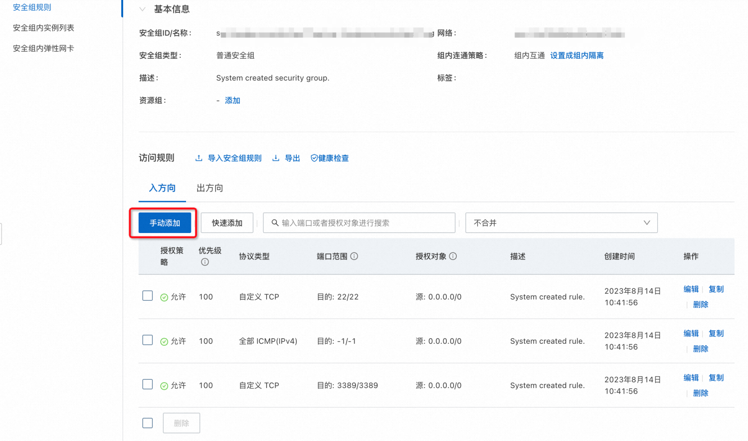 4.2 在如下页面中,选择入方向,单击手动添加。