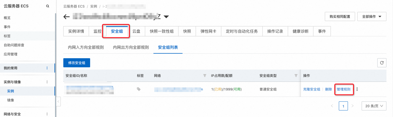 4.1 选择安全组,在所属安全组中,单击管理规则。