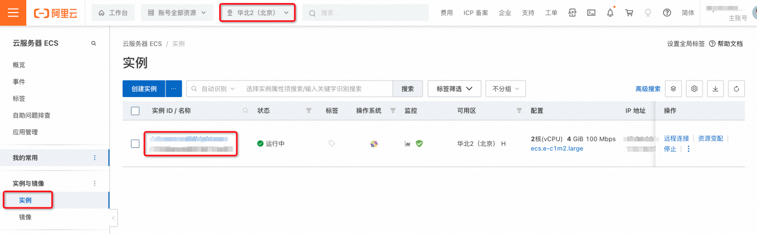 进入云服务器ECS控制台,点击实例,选择领用ECS所在的地域,本实验为北京。