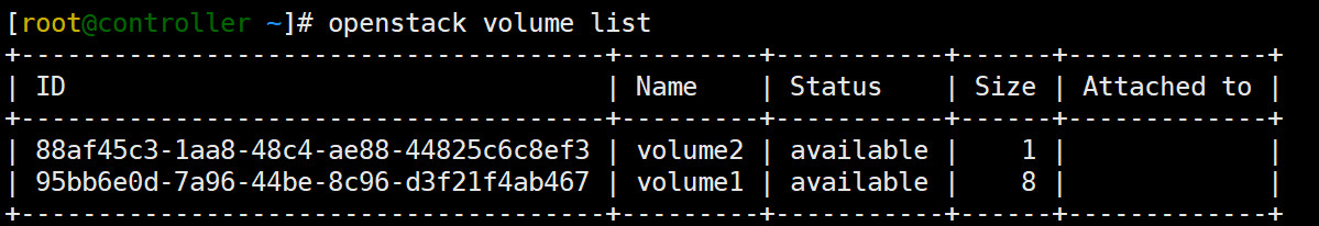 [root@controller ~]# openstack volume create --size 8 volume1